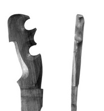 The gondolin is similar to the gondola, though smaller and lighter, used only for regattas with two oarsmen. The traditional stern fórcola is similar to that used for gondolas but higher and thinner (fig. 15), and has been recently modified so as to move the rowing point further to the front (fig. 16). The testa (head) has also been changed, eliminating the rear protrusion. The bow fórcola, which was initially high and straight like that of the sandolo, has gradually become shorter and extends outwards (fig. 17) forming a pronounced right-angled elbow (sanca). It has become the most difficult fórcola to make due to the stresses subjected on the wood - a problem which has become increasingly difficult as the morso moves further and further forward (fig.18).